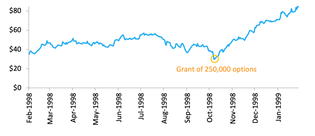 In October 1998, Comverse Technology granted 250,000 options with an exercise price of $30 to its CEO, Kobi Alexander. If the options were actually granted at the end of the fiscal year when the price was $85, the benefit of backdating a few months to obtain the lower exercise price was ($85 – $30) x 250,000 options = $13,750,000.
