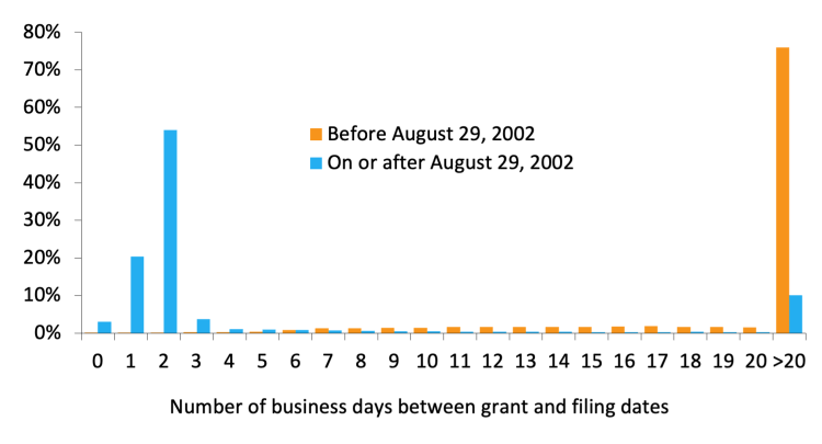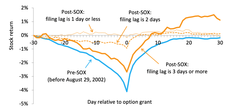 To the extent that companies complied with this new regulation, backdating should be greatly curbed. Thus, if backdating explains the stock price pattern around option grants, the price pattern should diminish following the new regulation. Indeed, we found that the stock price pattern is much weaker since the new reporting regulation took effect. Any remaining pattern is concentrated on the couple of days between the reported grant date and the filing date when backdating still might work, and for longer periods for the minority of grants that violate the two-day reporting requirements. Our evidence closed the case for backdating.